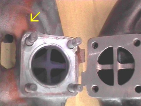 タービン側のポートにある各気筒の仕切りが、純正より長くなっています。